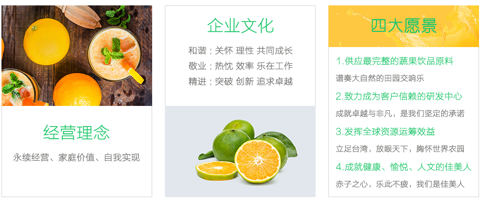我們秉承著專業(yè)技術(shù)及嚴(yán)謹(jǐn)?shù)慕?jīng)營態(tài)度,在不斷地鉆研、開發(fā)與創(chuàng)新下,成功地將四季水果的新鮮風(fēng)味與營養(yǎng)長期完整的保存。十月份果實(shí)成熟后,我們將最新鮮的果實(shí)用最天然的方式加工成果汁。